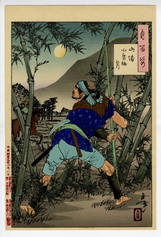 明治18年(1885)から明治25年(1892)にかけて、月岡 芳年 が最晩年に取り組んだ大作『 月百姿 』。和漢の物語や詩歌、謡曲の中の月にまつわる場面を題材とする全百枚からなる。作中で扱われる主題の多くが、源氏物語や平家物語、忠臣蔵など、伝統的に描かれてきた説話であるが、 芳年 は形式的な表現に陥ることなく、人物それぞれの内面感情をも描き出している。また、「月」の描写にも趣向が凝らされており、爪のように細い三日月から、画面いっぱいに明るく広がる満月まで、月齢がさまざまであるのみならず、あるときは水面に揺らぐ月、またあるときは画面の中に直接的には描かないなど、見る者をいつまでも飽きさせない。他に類を見ない 歴史画 として完成された傑作である。
