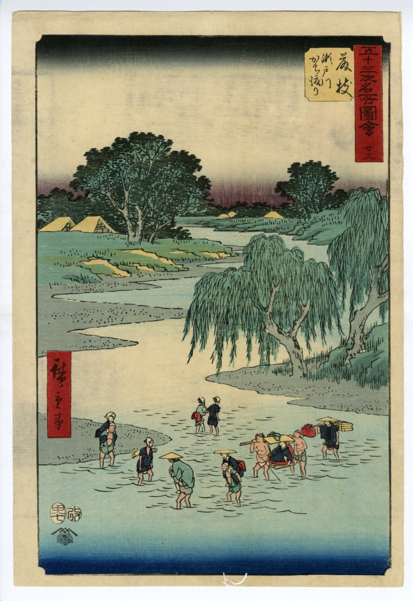 天保3年(1832)に刊行された『保永堂版 東海道五拾三次 』は、 広重 の浮世絵師としての地位を確立した作品だが、その後 広重 は20点もの東海道シリーズを描いている。保永堂版のおよそ23年後の安政2年(1855)、 広重 が59歳の時に最後の東海道シリーズとして制作したのが『五十三次名所図会』(一般に竪絵東海道)である。それまでの東海道シリーズとは異なり、大判という大きさの紙を縦に使っており、縦長の画面空間において 広重 は俯瞰構図を多用したほか、中には最晩年の代表作「 名所江戸百景 」へと繋がるような「近像拡大図」(近景のモティーフを大きく描く手法)の萌芽も見られる。