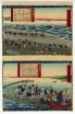 広重V(ひろしげ) 天保13年(1842)〜明治27年(1894)浮世絵師。画号に、重寅・重政・一立斎などがある。初代 広重 の門人で、初代 広重 、 二代広重 同様、『 東海道五十三次 』の制作も行ったが、作品の中心は開化絵である。発色の鮮やかな紅の合成染料を多用して描かれたその作品は「赤絵」と呼ばれ、明治当時の混乱した空気を今に伝えている。