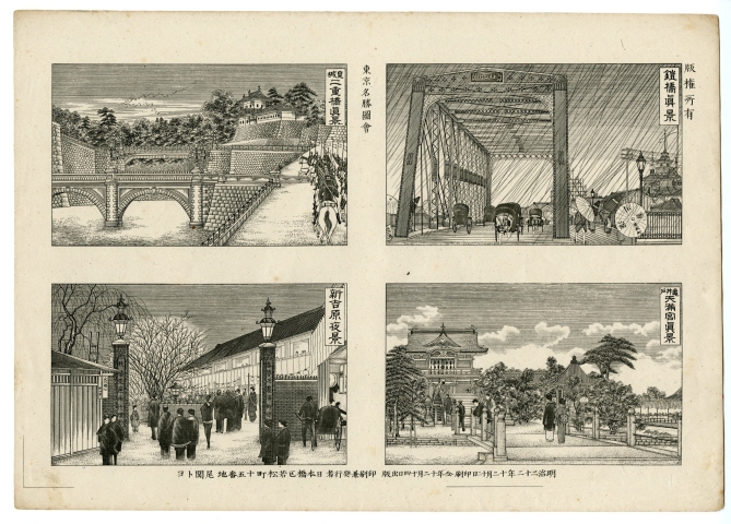| タイトル | 東京名勝図会 鎧橋真景/天満宮眞景/城皇爽二重橋真景/新吉原夜景 |