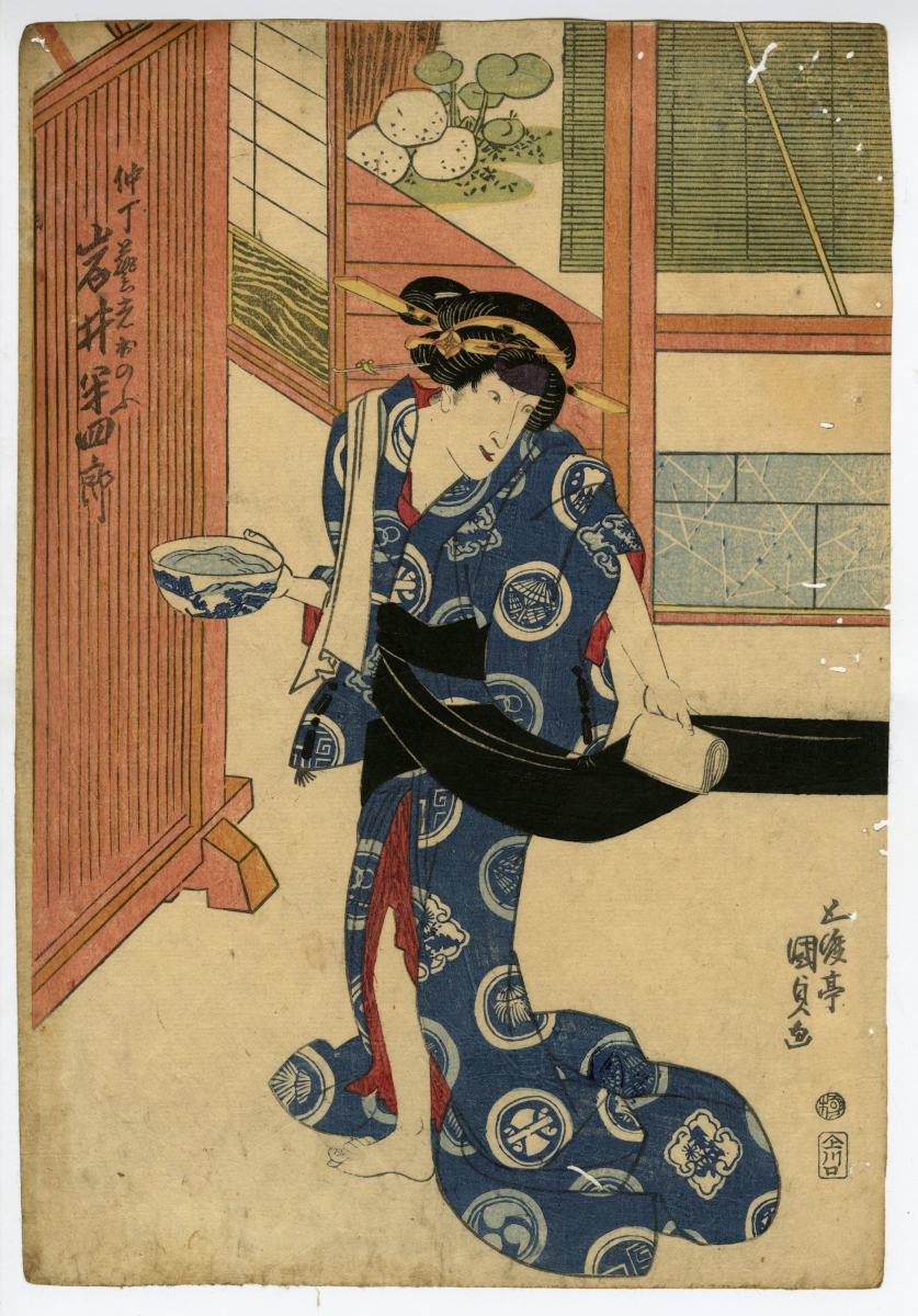 豊国V (国貞)(とよくに3( くにさだ)) 天明6年(1786)〜元治元年(1864)浮世絵師。画号に一雄斎・五渡亭・月波楼・琴雷舎・香蝶楼などがある。 初代豊国 の門人で弘化元年(1844)に豊国の号を継ぐ。舞台の興奮が伝わってくるような 役者絵 を描き、「 役者絵 の 国貞 」と呼ばれる。また 美人画 に於いても時代の好みを反映した粋で艶な猫背猪首型の美人を描き、人気の高さはその圧倒的豊富な作画量に象徴される。