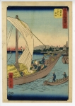 享和2年(1802)に刊行が始まった『東海道中膝栗毛』は、庶民の間に圧倒的な東海道人気を呼び起こした。東海道の宿場を描いた浮世絵も多く出版されたが、そのなかでも最もよく知られ、かつ最も完成度が高いのは、 広重 によるこの『 東海道五拾三次 』であろう。「保永堂版」として知られる本シリーズは、天保3年(1844)から同5年(1846)にかけて刊行された。情緒豊かな自然の景の中に、町を訪れた旅人やそこに暮らす人々をいきいきと描いており、単なる 風景画 の枠にとどまらない、一種の報道的要素を備えた作品といえる。 葛飾北斎 の『 冨嶽三十六景 』と並ぶ、浮世絵 名所絵 の傑作である。